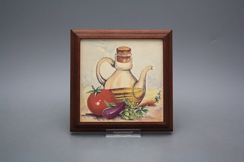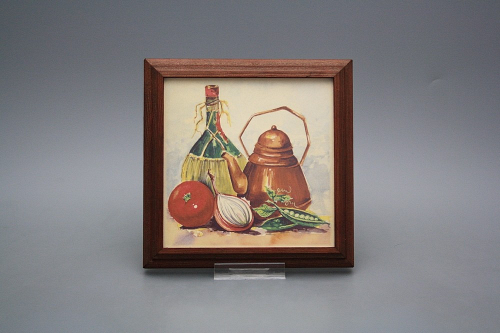Keramisches Bild zum Aufhängen mit Holzrahmen.