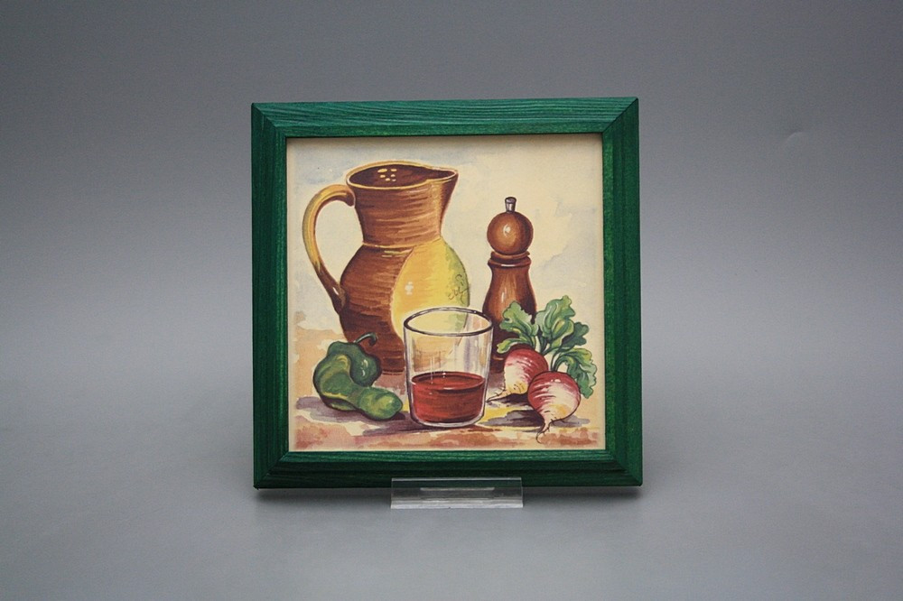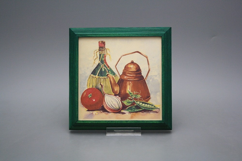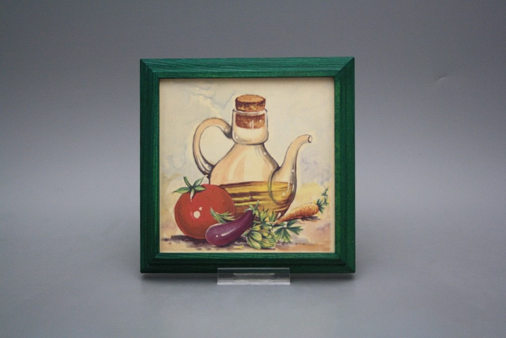 Keramisches Bild zum Aufhängen mit Holzrahmen.