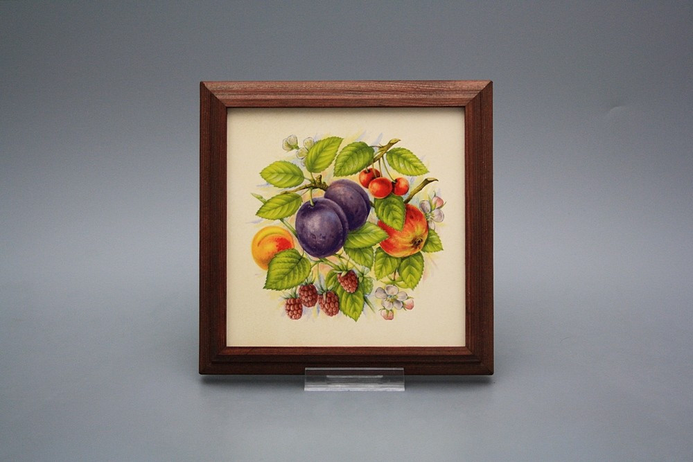 Keramisches Bild zum Aufhängen mit Holzrahmen.