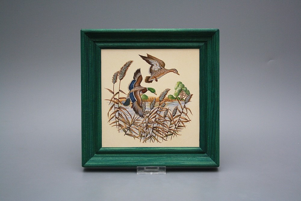 Keramisches Bild zum Aufhängen mit Holzrahmen.