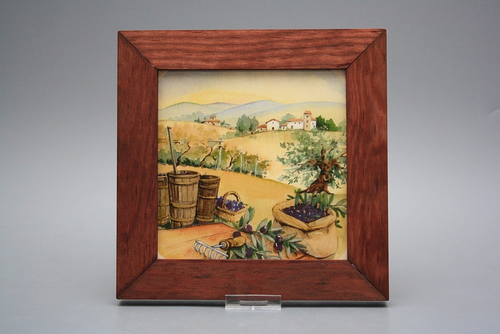 Keramisches Bild zum Aufhängen mit Holzrahmen.