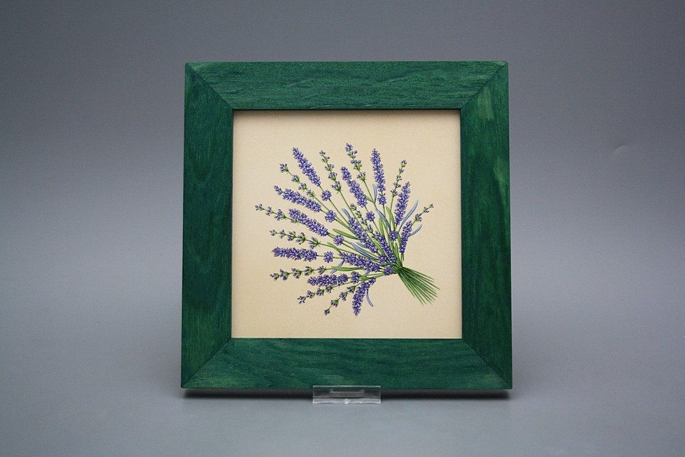 Keramisches Bild zum Aufhängen mit Holzrahmen.