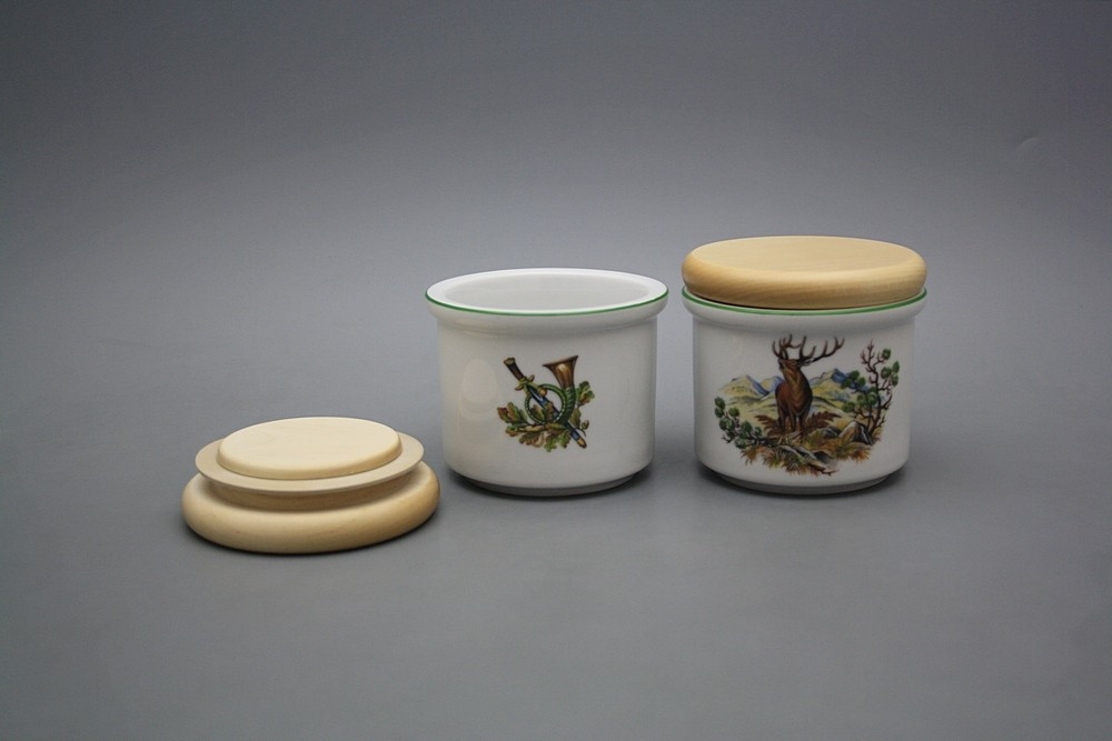 Praktische kleine Dose mit Holzdeckel, gefertigt aus böhmischem Markenporzellan von höchster Qualität. Spülmaschinenfest!!!